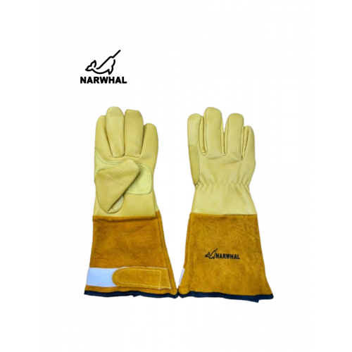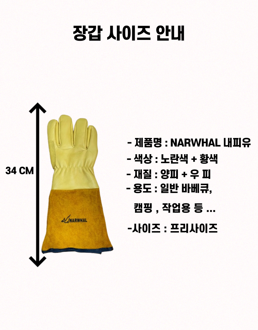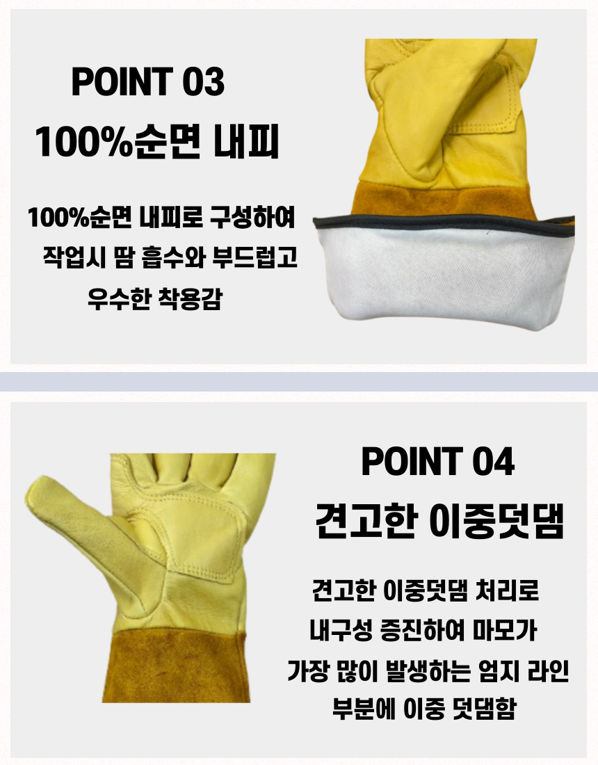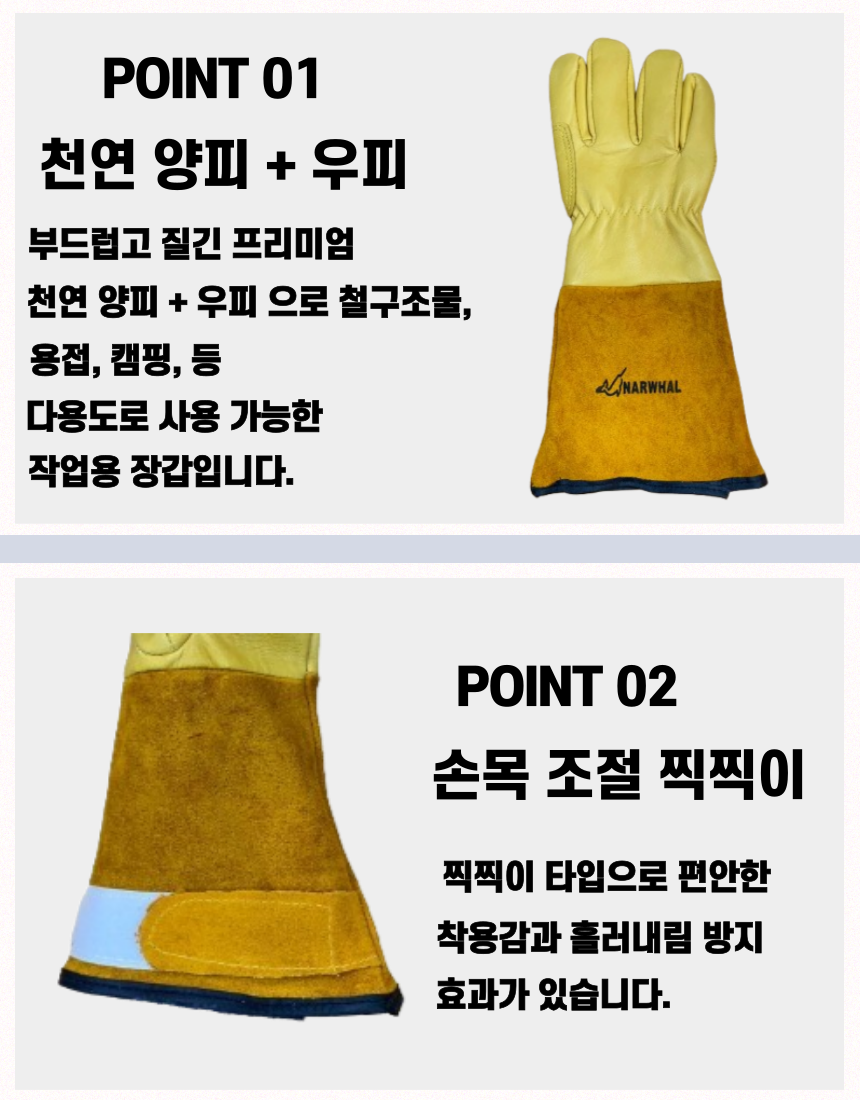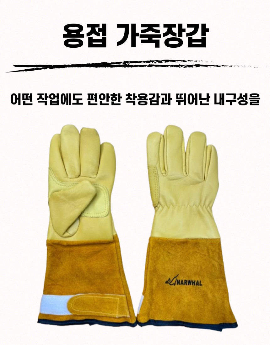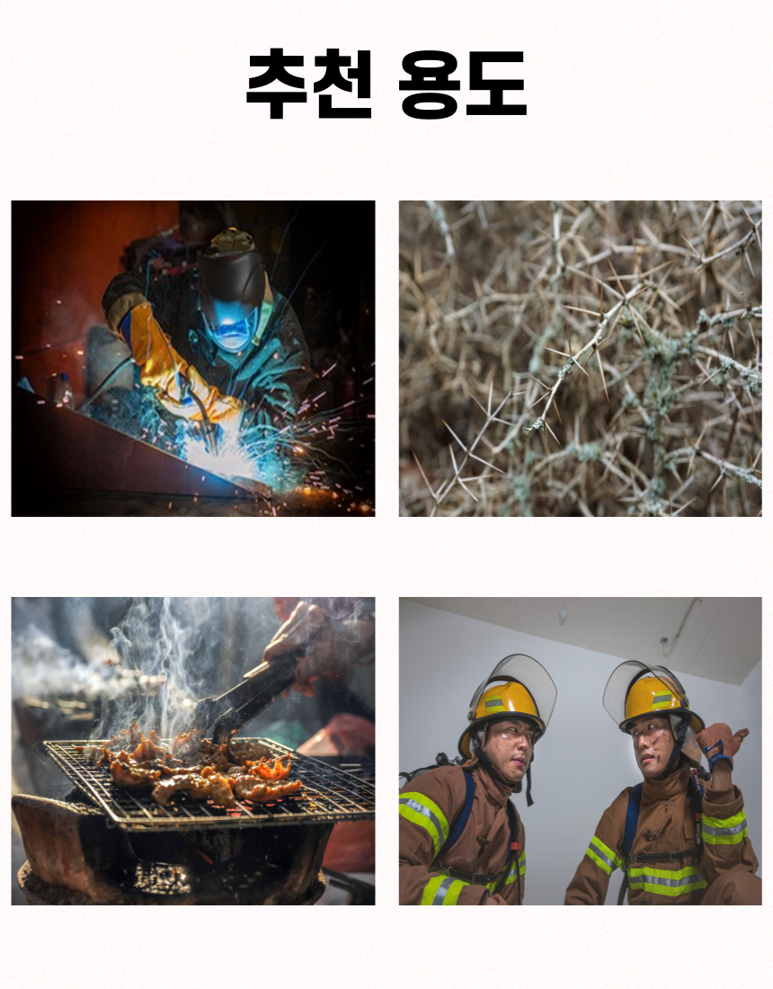 넓고 긴 우피 카우스소매로 불꽃으로부터 팔목 위까지 더욱 안전하게 보호 재봉선 보강으로 내구성을 높임 카우스에 데님 내피 사용내용 용접, 철강, 토목, 건설, 캠핑, 물림방지, 가시, 열차단