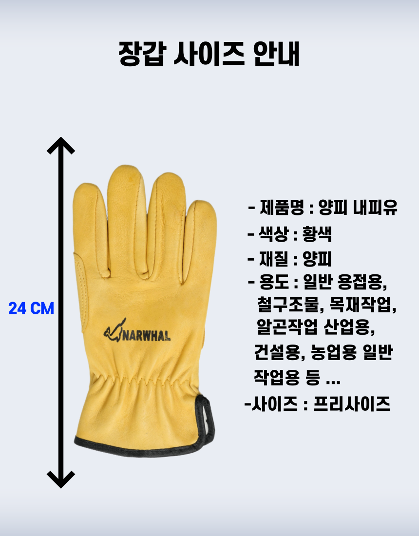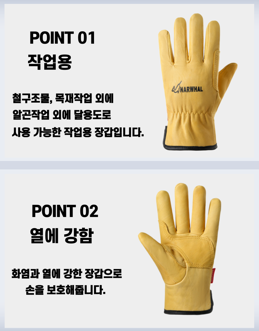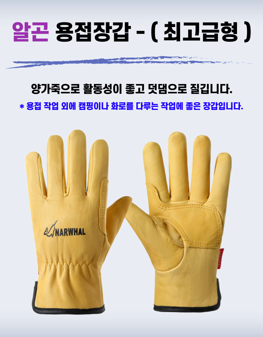 최고급양피를 사용하여 내구성과 손의 움직임이 좋음 손바닥 부분의 양가죽으로 이중덧댐하여 내마모성 강화 손목 주름으로 편안한 움직임 손목 벨크로를 통하여 조절과 탈착 용이 면안감으로 부드러운 착용감과 땀흡수율 증가내용 용접, 철강, 토목, 건설, 캠핑