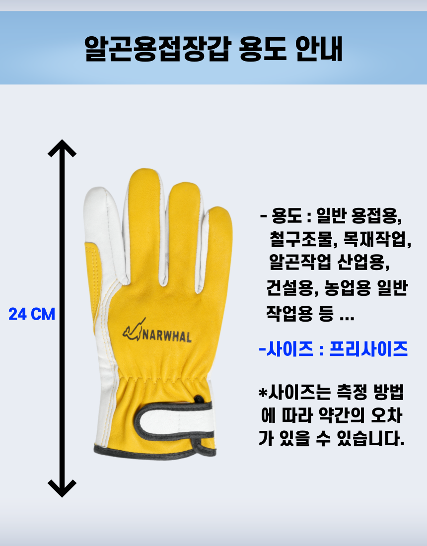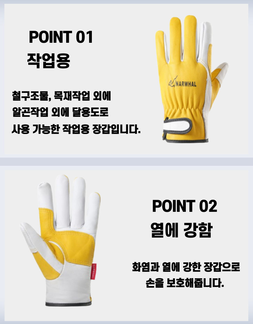 최고급양피를 사용하여 내구성과 손의 움직임이 좋음 손바닥 부분의 양가죽으로 이중덧댐하여 내마모성 강화 손목 주름으로 편안한 움직임 손목 벨크로를 통하여 조절과 탈착 용이 면안감으로 부드러운 착용감과 땀흡수율 증가내용 용접, 철강, 토목, 건설, 캠핑